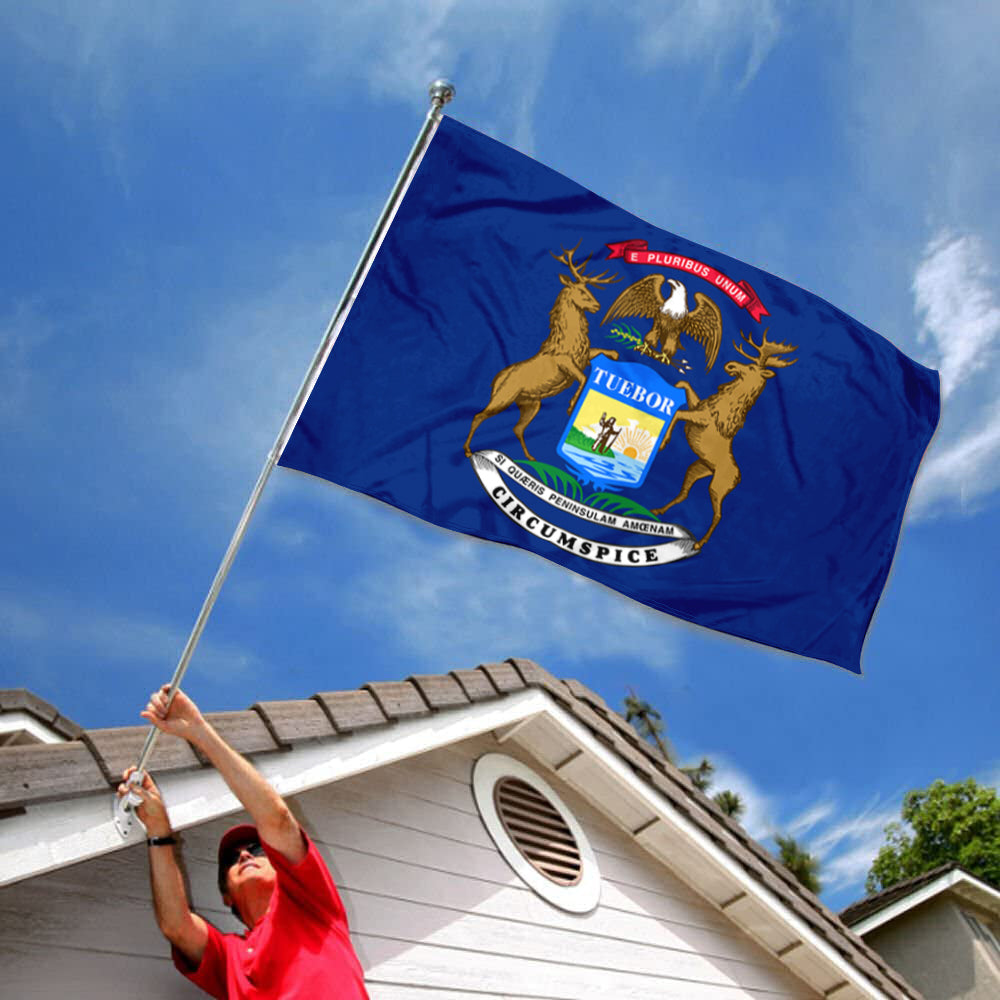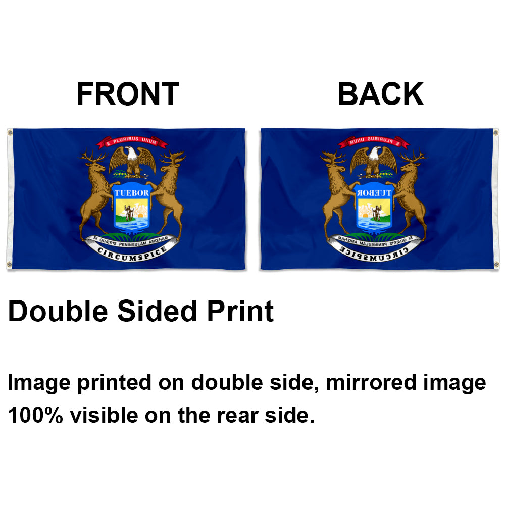 - Features a dark blue field with the state seal (elk, bald eagle, and Latin slogans like "TUEBOR" & "SI QUÆRIS PENINSULAM AMÆNAM CIRCUMSPICE"), echoing the state’s natural landscape and ideals, ideal for man cave decor with Midwest state vibe.