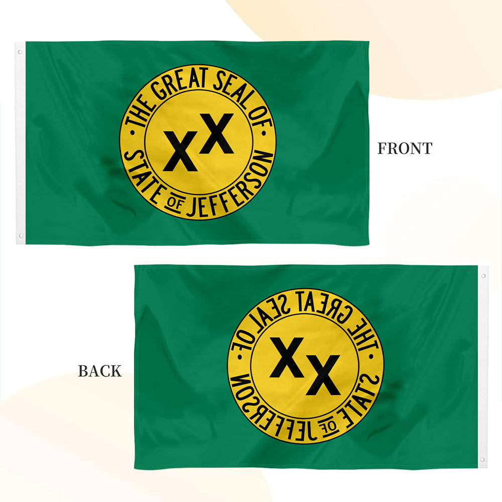 - Features a faithful reproduction of the iconic State of Jefferson flag with green field, golden double cross and star emblem, capturing the spirit of West Coast regional pride for distinctive man cave decor.